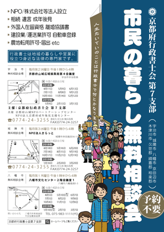京都府行政書士会第7支部では、宇治市と城陽市、八幡市で、それぞれ毎月1回づつ「市民の暮らし無料相談会」を実施しています。相続や遺言に関するご相談が、毎回、数多く寄せられています。今、お困りの方は、どちらの会場でもお気軽にお越しください。